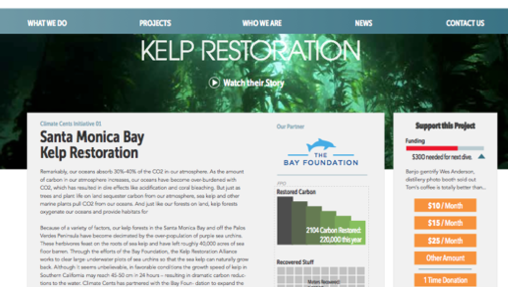 Climate Cents is in the process of launching. We are in the beta-phase now, creating a website and testing the user-experience of it with a group of beta-users, while also experimenting with organizational partnerships and data-collection. During the beta phase, the test group will be donating to the Kelp Restoration Project at The Bay Foundation. Since nearly 40% of the CO2 in our atmosphere is absorbed by our oceans, kelp forests have been identified as effective carbon sinks that can sequester carbon and mitigate the effects of climate change. Climate Cents has already formed a relationship with the Bay Foundation for this purpose. As users follow the project they have funded, we will track how they experience the interactive process.
