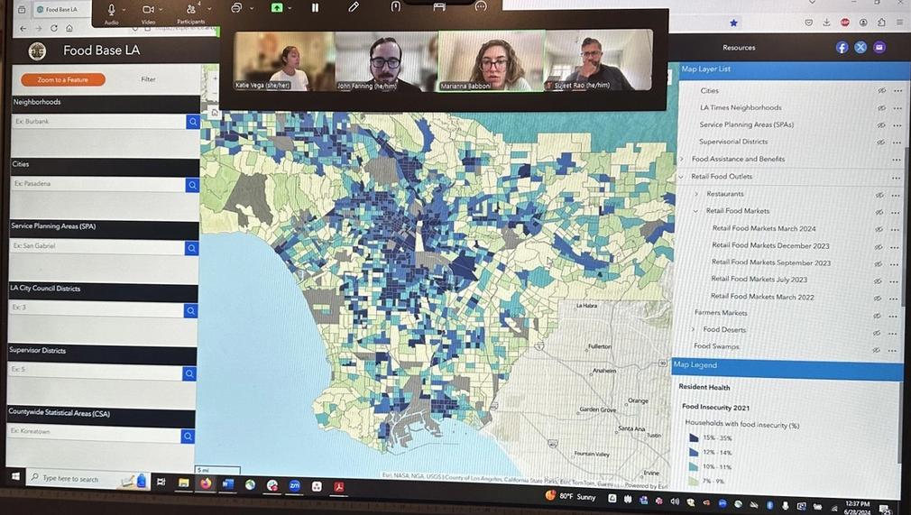Food insecurity—lacking access to enough food to live an active, healthy life because of limited resources—is a crisis in LA County (LAC) that the USC team has been tracking since 2020. Currently, 2.1M adults experience food insecurity, 2.7M experience nutrition insecurity, and the impact is highly inequitable: rates of each are approximately 1.5-2.5 times higher among Black and Latine residents vs. white. In 2022 the LAC Food Equity Roundtable—a consortium of local government, foundations, CBOs, private sector, and academic advisors—released a comprehensive 10-yr Action Plan of initiatives to improve resident access to adequate, healthy food. With deep expertise in spatial analysis and public health nutrition, the USC team will provide critical data and analysis through its food system dashboard to the many organizations providing direct Action Plan and related services to residents, to help ensure the Plan's goal of sustainable, equitable, systemic food system change in LAC.
