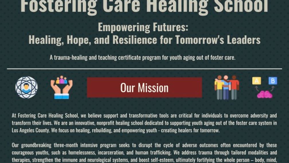 Fostering Care: We Are Healing the Healers of Tomorrow. Fostering Care: the first 90-day, trauma-healing and healing trade intensive for youth ages 18-21, “aging out” of the foster care system. Each semester has a student body of 20 youth. The pilot semester is set to commence in Los Angeles County, 2024. Fostering Care believes that this unique demographic, due in no small part to their profound resilience, once safe, secure, and actualized, become powerful leaders and transformers.